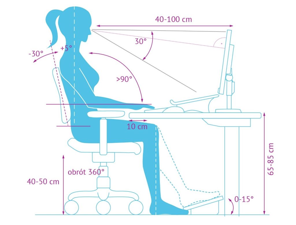 - górna krawędź monitora powinna się znajdować na wysokości oczu siedzącego użytkownika lub lekko poniżej. Przy zbyt wysoko umieszczonym monitorze jest dłuższa droga wzroku pomiędzy dokumentem, ekranem, a klawiaturą, czego efektem jest większy wysiłek oraz bóle szyi będące skutkiem nienaturalnego ułożenia głowy. Zalecany kąt obserwacji ekranu monitora wynosi 20°-50° w dół,